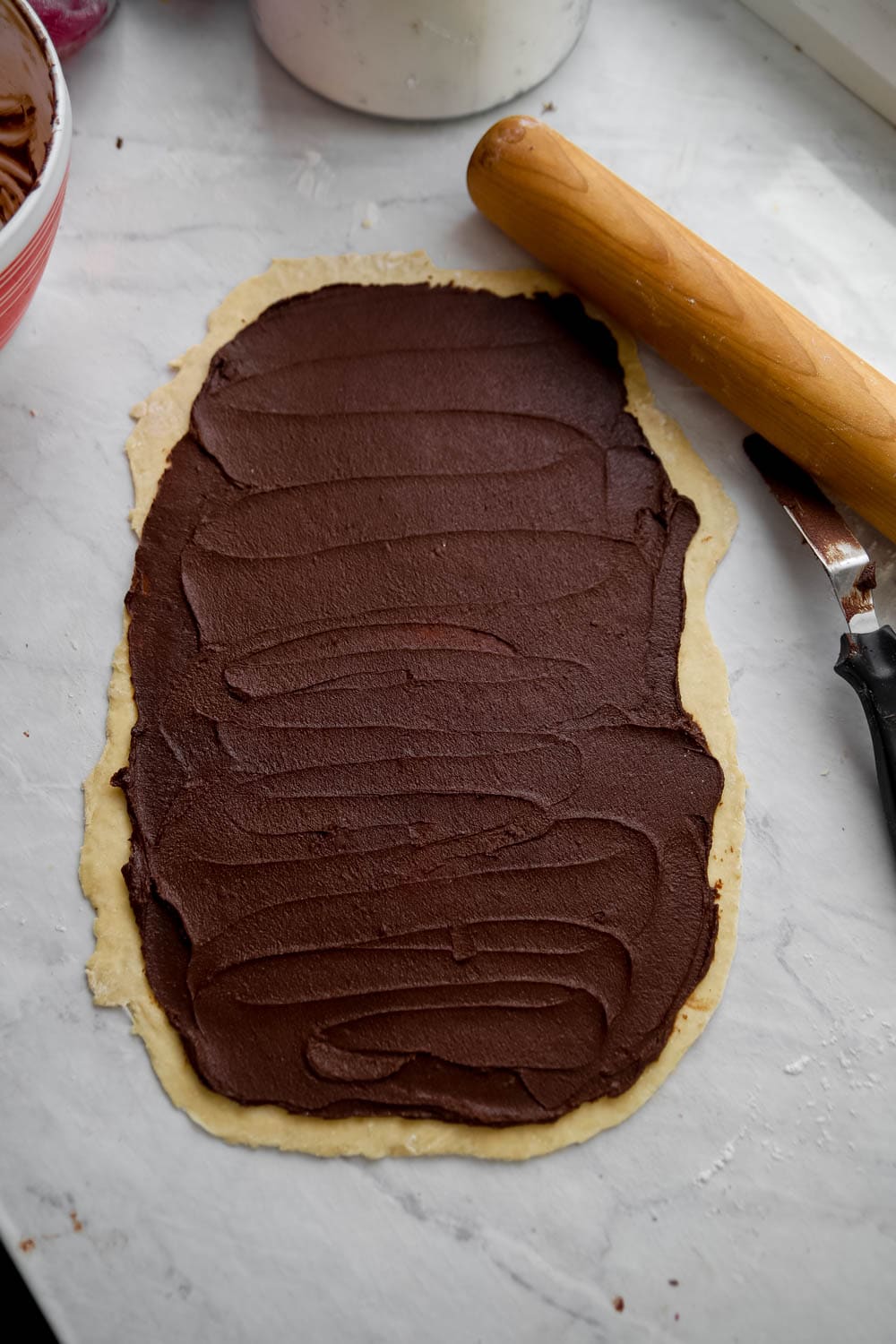 Spread ⅓ of the chocolate filling onto the rectangle of dough in a thin layer, using a small offset spatula. Leave 1/2" border all around. With the long edge facing you, fold the dough up in half lengthwise, enclosing the chocolate filling. Gently tug the edges and corners to meet, and use fingertips to press down the edges to seal. This helps prevent the chocolate filling from escaping.